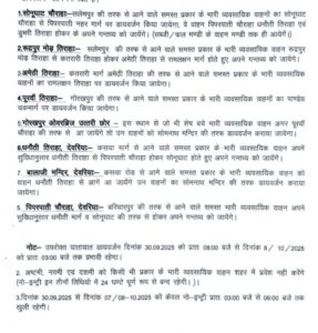 जारी प्रेस विज्ञप्ति के अनुसार, 30 सितंबर 2025 की सुबह 8 बजे से 8 अक्टूबर की सुबह 3 बजे तक डायवर्जन लागू रहेगा। वहीं, अष्टमी, नवमी और दशमी के दिन 24 घंटे तक किसी भी प्रकार के भारी वाहन शहर में नहीं घुस पाएंगे।